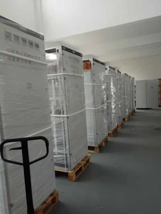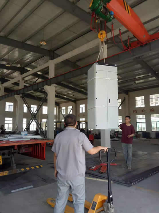 車(chē)間工人正在將電源柜柜體卸車(chē)