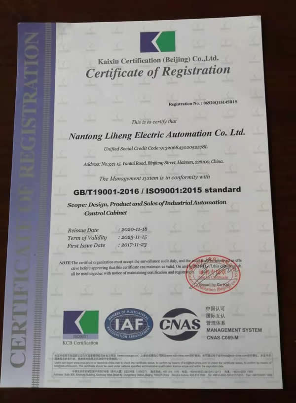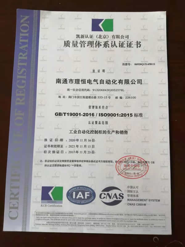 近日,我司工業(yè)自動(dòng)化控制柜生產(chǎn)和銷(xiāo)售的全面質(zhì)量管理體系通過(guò)有關(guān)專(zhuān)家組織的現場(chǎng)考評驗收,公司管理體系符合GB/T19001-2016/ISO9001:2015標準,換取新證。